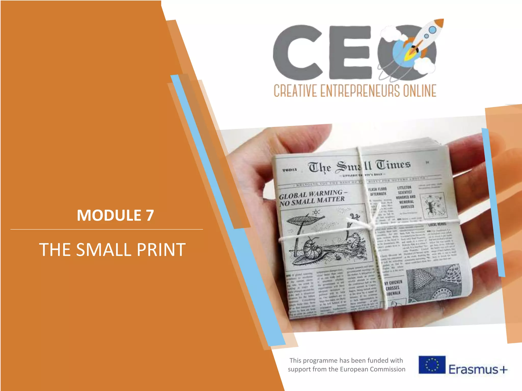This module introduces creative entrepreneurs to some of the legal implications of selling online, covering topics like consumer law, consumer rights regarding online purchases, and data protection. It provides an overview of key consumer rights in the EU like the right to clear information before buying, refunds for undelivered or faulty goods, cancellation and returns, and protections for personal data collected by online retailers. The module emphasizes the importance of security, privacy and trust in online consumer behavior.