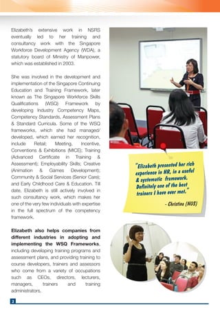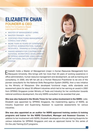 Elizabeth Chan has over 40 years of experience in human resources, training, and consultancy. She has developed competency standards and frameworks for over 30 industries in Singapore through her work with various government agencies. She is considered a pioneer and expert in competency-based learning and development in Singapore.