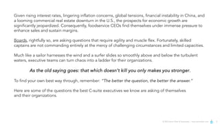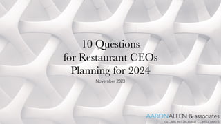 The document outlines critical questions for restaurant CEOs as they navigate economic challenges and strategize for growth and performance in 2024. Key concerns include capital expenditures, operating expenses, technology investments, entering new markets, and overall business optimization strategies. The overarching theme emphasizes the need for agile decision-making and visionary leadership to sustain and enhance business success amid a complex landscape.