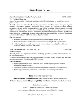 Allen Roberts is an accomplished executive with extensive experience in operations, strategic planning, and product marketing in the telecommunications and computer industries. He has successfully led organizations to increase sales and improve profitability while managing large teams and implementing strategic restructuring. His key achievements include significant revenue growth, productivity enhancements, and the establishment of international marketing channels.