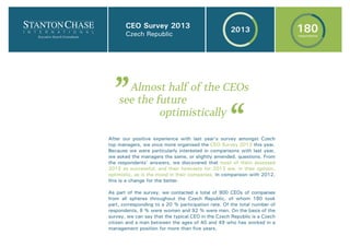 The survey summarizes the responses from 180 CEOs in the Czech Republic on their outlook for 2013 and experience in 2012. Most respondents assessed 2012 as successful and have an optimistic outlook for 2013, with 38% viewing the economic prospects as neutral and 42% as somewhat or very optimistic. Nearly half of the CEOs expect to see the greatest growth in the information technology and telecommunications sectors. The majority of respondents characterized the atmosphere in their companies as optimistic in 2012.