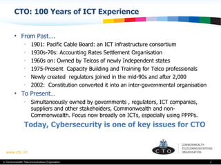 The document summarizes a presentation given at the 2010 Cyber Security Forum hosted by CTO (Commonwealth Telecommunications Organisation). CTO is an intergovernmental organization focused on ICT capacity building and training. The presentation discusses CTO's role in cybersecurity including advocating for robust frameworks, building capacity through training and research, and facilitating knowledge sharing and international cooperation to address cyber threats. It invites attendees to partner with CTO on future cybersecurity activities and programs.