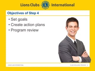This document outlines the objectives and steps of a club program review, including reviewing club characteristics, setting goals, and creating action plans. It provides templates for writing specific, measurable, action-oriented, realistic and time-bound goals and action plans to improve the club in areas like service, communication, membership, and leadership. Club members are guided to work in partners to develop goals and action plans to present to the club for approval and implementation.