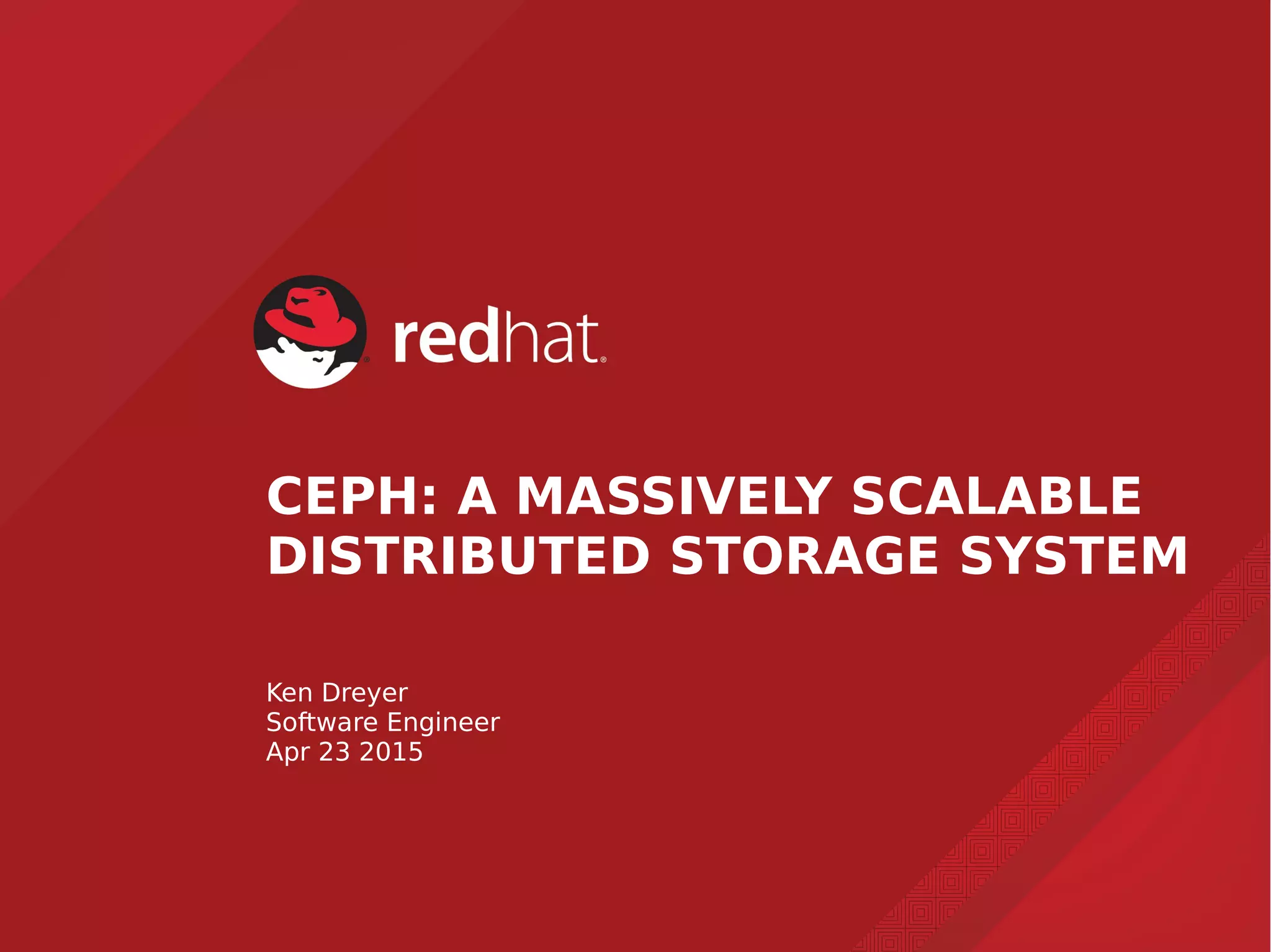 Ceph is a scalable distributed storage system that offers economic and operational benefits through a reimagined approach to storage infrastructure, suitable for various use cases, especially in cloud environments. The architecture involves components like RADOS, RBD, and CephFS, which support object, block, and file storage applications while ensuring reliability and scalability. Development milestones include its launch in 2004, RHEL-OSP certification in 2014, and continuous improvements through community engagement and contributions.