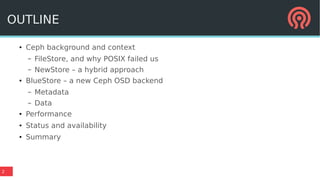 BlueStore is a new storage backend for Ceph that stores data directly on block devices rather than using a file system. It uses RocksDB to store metadata like a key-value database and pluggable block allocation policies to improve performance. BlueStore aims to provide more natural transaction support without double writes by using a write-ahead log. It also supports multiple storage devices to optimize placement of metadata, data and write-ahead logs.