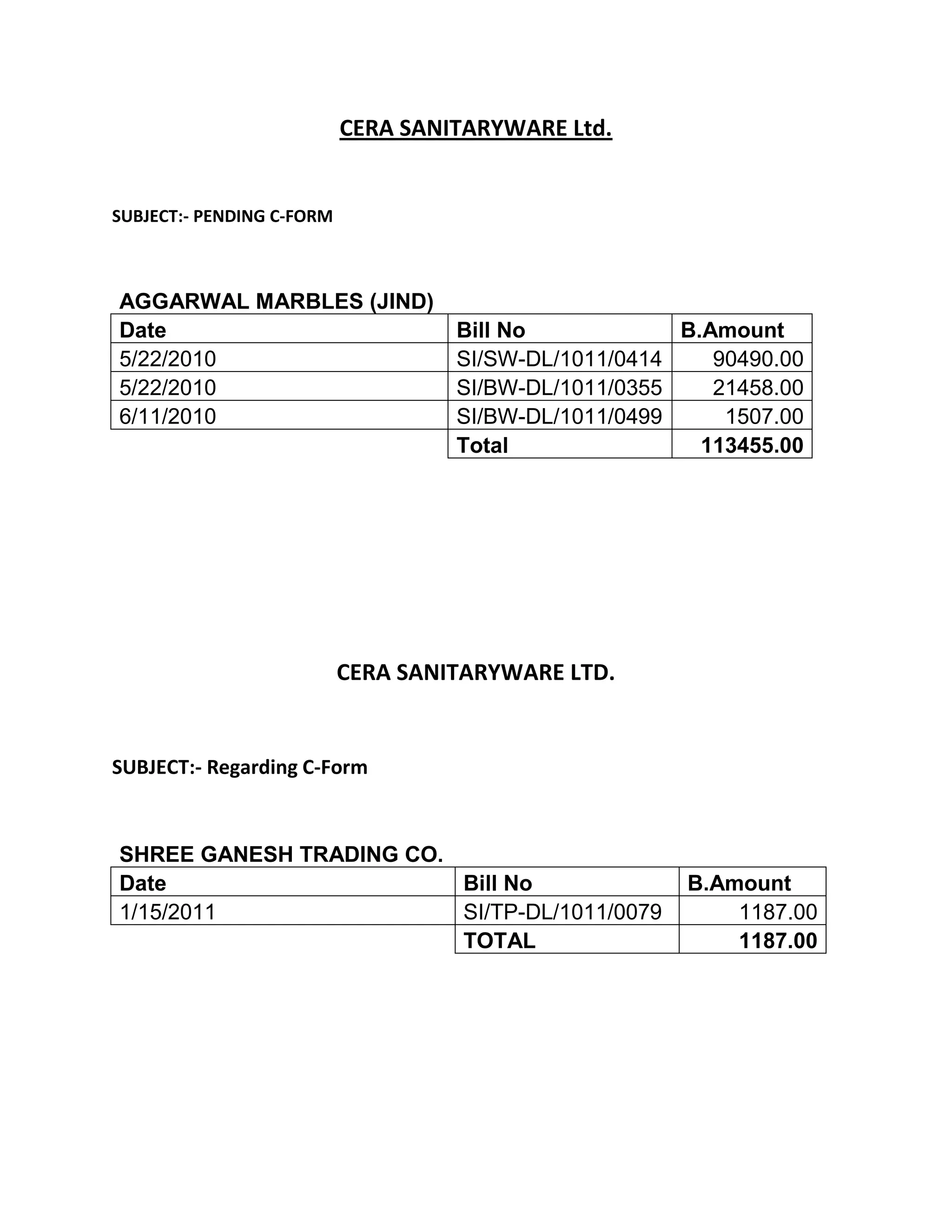 Aggarwal Marbles in Jind owes Cera Sanitaryware Ltd. Rs. 1,13,455 according to three unpaid bills from May and June 2010. Shree Ganesh Trading Co. owes Rs. 1,187 according to an unpaid January 2011 bill. Cera Sanitaryware Ltd. is following up about pending C-forms from these two customers who have outstanding payments.
