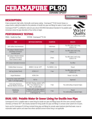 Ceramapure PL90 is a two-component, high solids epoxy coating formulated for protecting ductile iron pipe and fittings used in water and sewer systems. It provides corrosion resistance in acid, salt, and alkaline conditions as shown through various performance tests. Ceramapure PL90 is certified for use in potable water systems for pipe diameters 4 inches or larger, and can be used to line pipe and fittings for applications like osmotic water treatment plants, reuse/reclamation water, and sewer lines where cement mortar lining cannot be used.