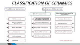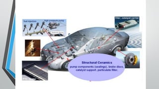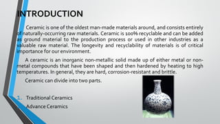 Ceramics are inorganic, non-metallic materials made from metal or non-metal compounds and hardened by heat. There are traditional ceramics derived from natural materials like clay and quartz, used to make tableware, bricks and tiles. Advanced ceramics have superior properties and include structural, electronic, and bio-ceramics. Ceramics are widely used in engineering applications due to their corrosion and heat resistance, used in automotive and jet engine components, electronic devices, cutting tools, and aerospace structures like rocket nozzles.