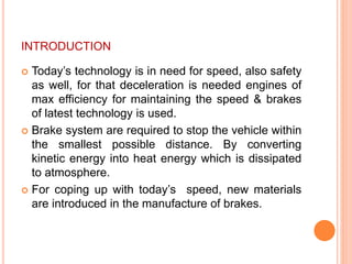 The document discusses ceramic disc brakes (CDB) as a modern alternative to traditional cast iron brakes, highlighting their advantages such as being lighter, improving fuel efficiency, and better performance in wet conditions. It outlines the construction of disc brakes, including the transition to ceramic materials and innovations by manufacturers like Porsche in developing high-performance brake systems. Despite their high initial cost, ceramic disc brakes are expected to be more prevalent in future vehicles due to their superior performance and longevity.