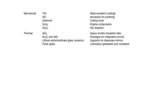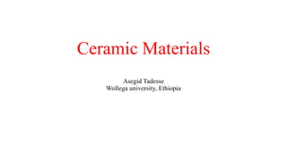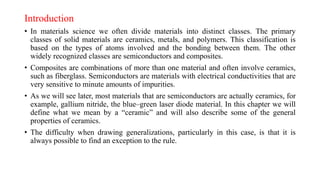 This document provides an overview of ceramic materials. It defines ceramics as nonmetallic inorganic solids made through processes like shaping, drying, and firing. Ceramics exhibit properties like brittleness at room temperature due to their ionic and covalent bonding, but some can deform at high temperatures. The document discusses how ceramics are classified and notes exceptions to general rules due to their wide range of properties and applications in different fields.