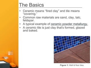 Ceramic tiles are made from clay that is formed, glazed, and baked. The process begins with crushing and grinding raw materials like sand, clay, and feldspar into a fine powder. This powder is mixed with water and other ingredients to form a slurry that is dried and then shaped. The tiles are then glazed by applying a glass-like coating and fired at high temperatures to strengthen them. Additional firing may be done after glazing to further harden the glaze. Finishing steps like grinding can be done to improve dimensional accuracy or the surface.