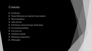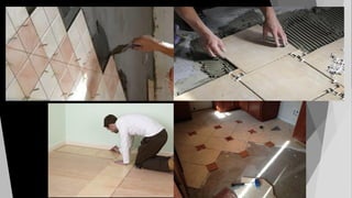 This document provides an overview of ceramic tiles, including their fabrication, physical properties, types, advantages, and disadvantages. It highlights the manufacturing process, maintenance requirements, and installation methods, emphasizing their durability and aesthetic versatility for various interior applications. Additionally, the text covers environmental attributes and the life cycle cost associated with ceramic tiles.