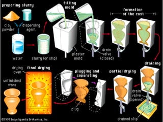 This document provides an overview of ceramics. It defines ceramics as compounds made from metallic and non-metallic elements, most commonly oxides, nitrides, carbides, and silicates. Ceramics are classified as either traditional or advanced, with traditional ceramics derived from natural raw materials and advanced ceramics used in specialized industrial applications. The document discusses the classification, properties, processing, and applications of various ceramic materials and products.