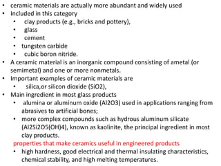 Ceramics can be divided into three main categories based on their processing: traditional ceramics made from clay and other silicates, new ceramics made from synthetic materials like oxides and carbides, and glasses which have a non-crystalline structure. The processing of ceramics typically involves crushing and grinding raw materials, shaping, drying, and high-temperature firing. Shaping methods include casting, plastic forming techniques like extrusion and injection molding, and pressing operations. Drying removes moisture without causing cracking, while firing sinters the particles to develop strength and hardness through bonding. The properties of ceramics make them useful for a wide range of applications.