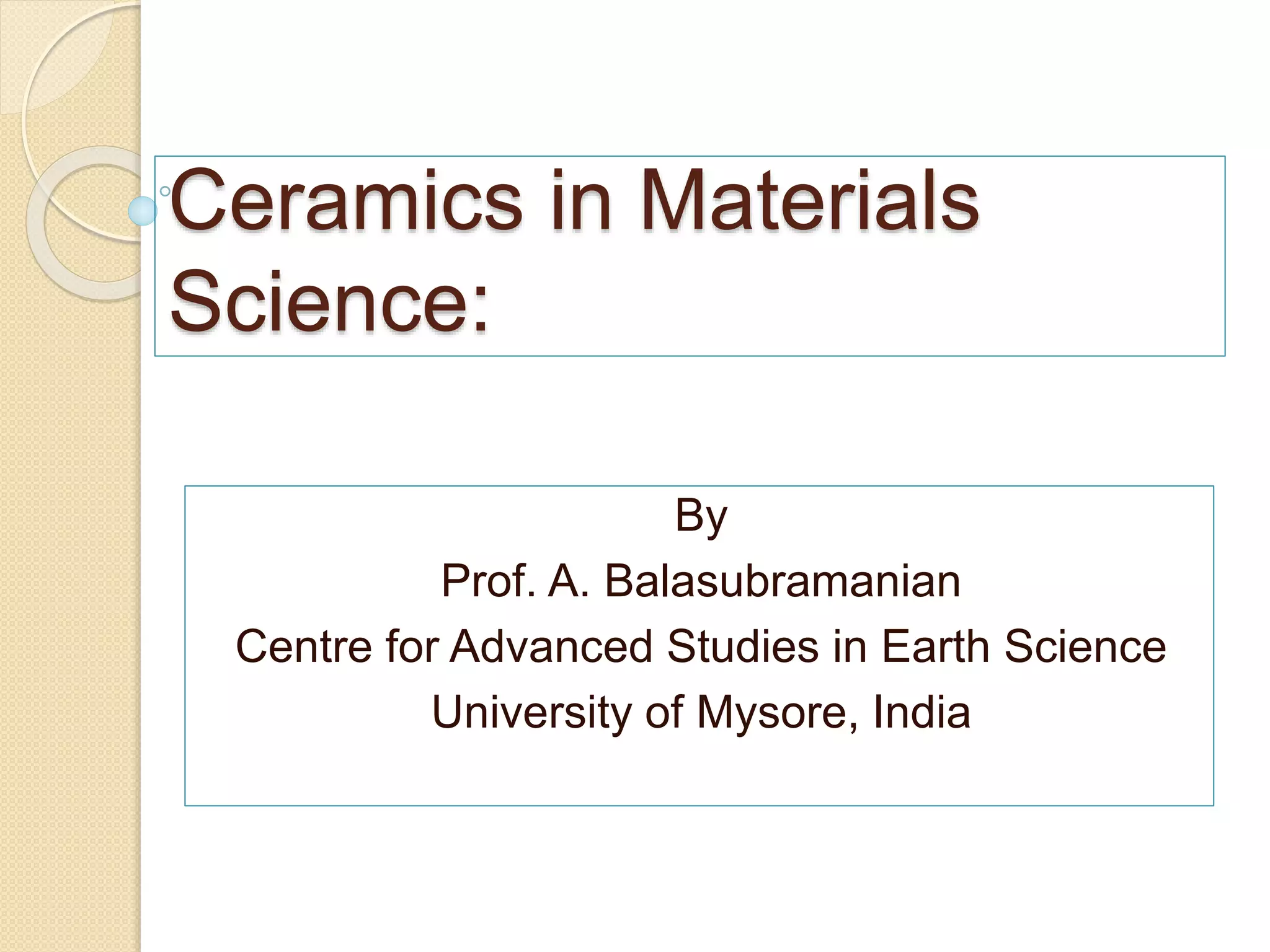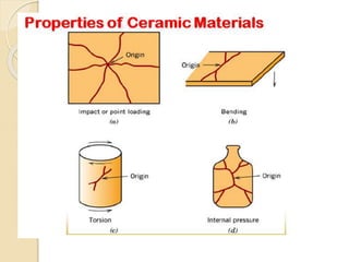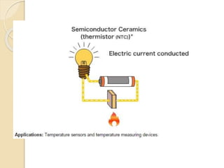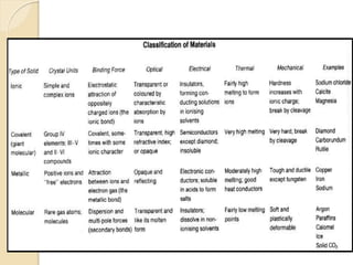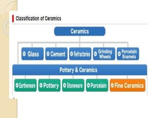 This document provides information about ceramics and pottery materials science. It discusses the classification of solids as crystalline or amorphous and describes properties of materials like mechanical, electrical, thermal and optical properties. It explains the structure of solids at subatomic, atomic, microscopic and macroscopic levels. Different types of materials are outlined including metals, semiconductors, ceramics and polymers. The document also discusses the various stages of clay bodies from greenware to bisque and glaze firing. Different clay types used for pottery like earthenware, kaolin, ball clay and fire clay are described.