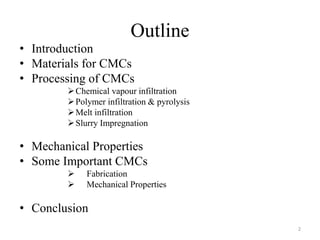 The document discusses ceramic matrix composites (CMCs), including the materials and processing methods used to produce them. It describes common matrix materials like Al2O3 and SiC and reinforcements like fibers and whiskers. Popular fabrication techniques are outlined, such as chemical vapor infiltration, polymer infiltration and pyrolysis, melt infiltration, and slurry infiltration. The mechanical properties of CMCs are summarized, focusing on fracture toughness which is improved through mechanisms like crack deflection and fiber pull-out. Specific CMC systems analyzed include SiC-SiC, ZrB2-SiC, TiB2-SiC, and Al2O3-SiC composites.