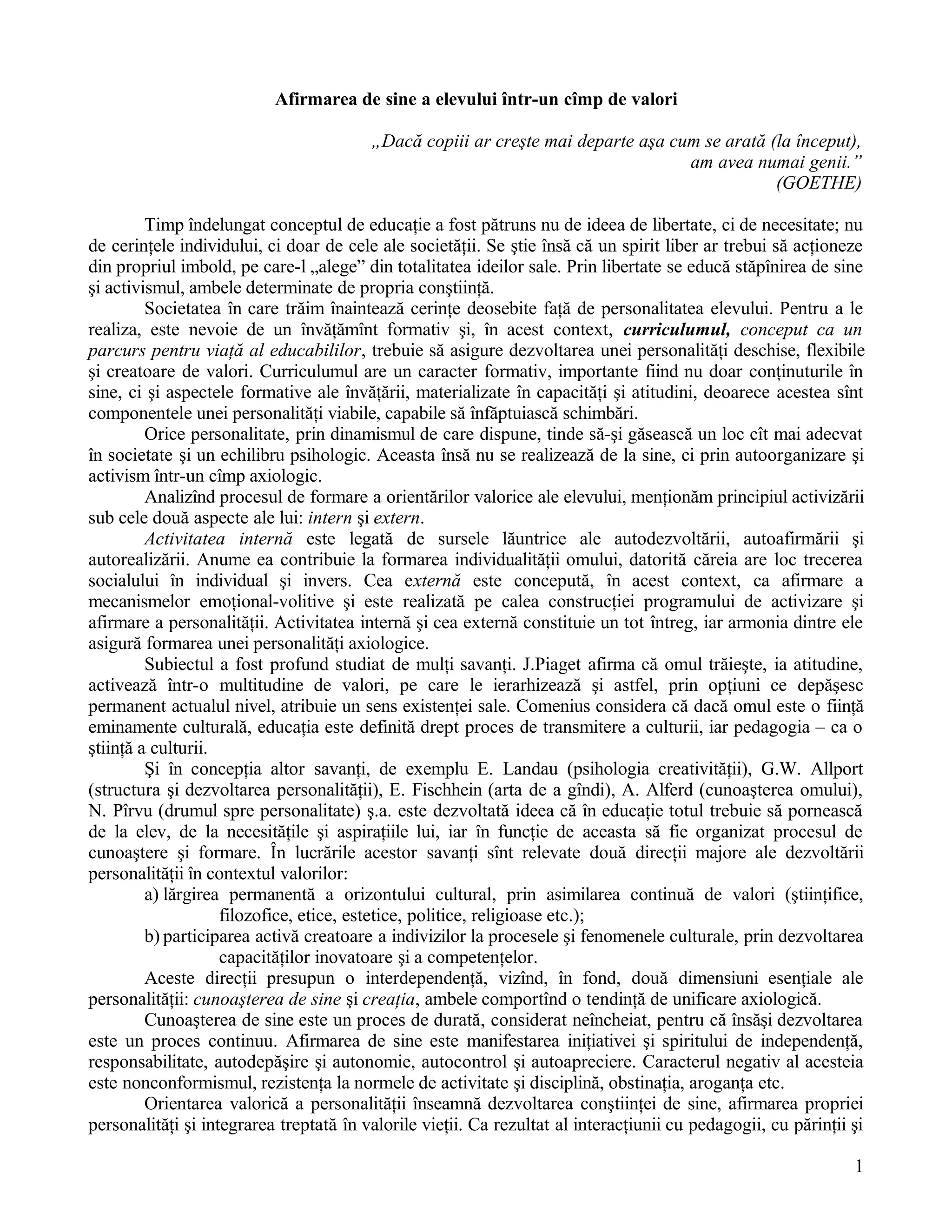 Documentul discută despre importanța afirmării de sine a elevului și necesitatea ca educația să se centreze pe individualitatea și aspirațiile acestuia, în loc de a se conforma strict normelor societății. Se subliniază rolul unui curriculum formativ care să dezvolte o personalitate deschisă, flexibilă și creativă, ca esențială pentru adaptarea elevului la cerințele sociale și pentru menținerea unui echilibru psihologic. Autorii argumentează că educația trebuie să plece de la nevoile elevului, iar profesorii ar trebui să devină îndrumători în procesul formării valorilor și abilităților acestora.
