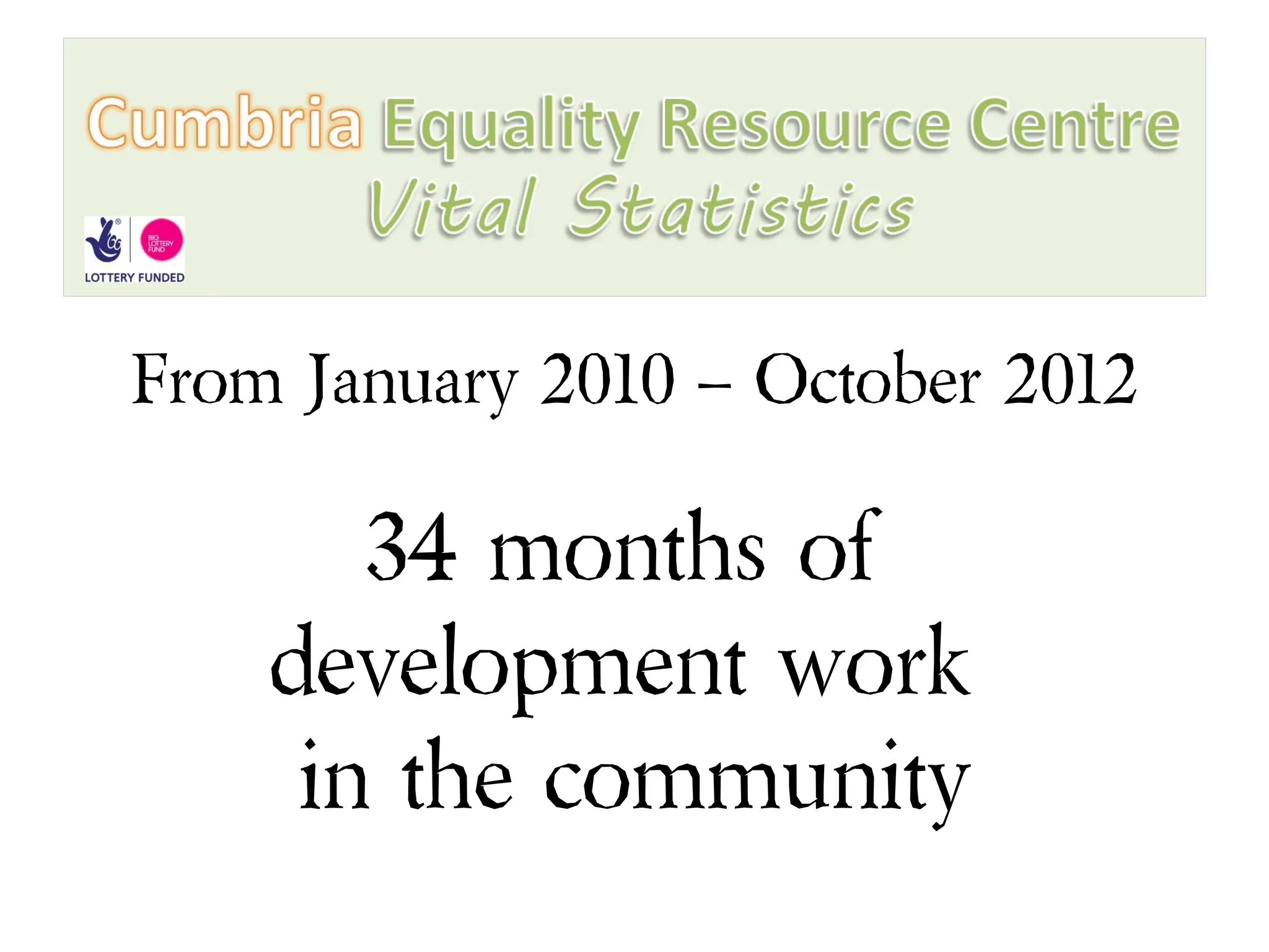 Over 34 months from 2010 to 2012, the Cumbria Equality and Diversity Partnership engaged in extensive community development work through 3 community development workers and 3 host organizations. They engaged over 25 BME groups, 12 LGBT groups, and 13 disability groups as well as 247 mainstream organizations. During this time, they held 62 trainings, hosted 148 events, supported 23 funding applications worth £529,000, mediated 8 conflicts, reported 558 hate crimes, wrote 19 press releases and 60 newsletters, designed 68 publicity materials, wrote 46 reports, and made 3,739 database entries while developing dozens of partnerships and hundreds of friends.