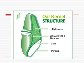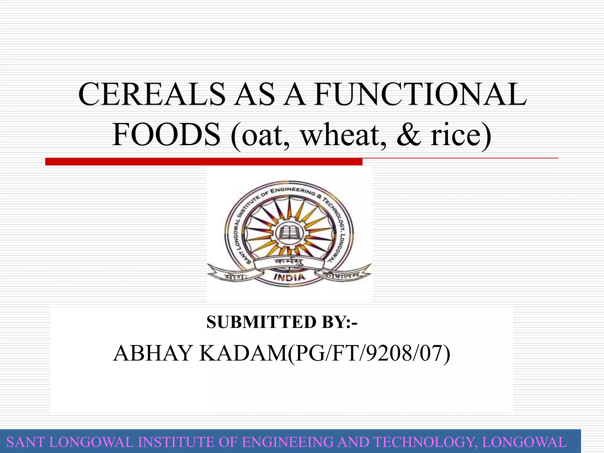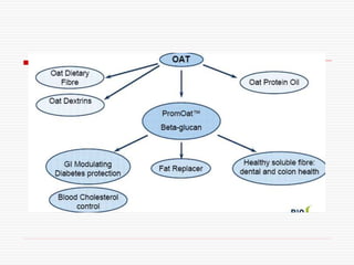 This document discusses cereals, specifically oats, wheat, and rice, as functional foods. It provides details on the nutritional composition and health benefits of oats, wheat bran, and beta-glucan. Oats contain beta-glucan, a soluble fiber that can help reduce LDL cholesterol and blood pressure. Wheat bran is high in dietary fiber and antioxidants that support digestive health and may reduce risks of colon cancer, breast cancer, and gastrointestinal disorders like constipation and diverticulosis.