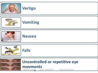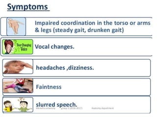 Cerebellar dysfunction can cause ataxia, a lack of muscle coordination. The cerebellum controls fine movements and posture. Damage to the cerebellum disrupts these functions. Ataxia affects walking, limb movements, speech, and eye movements. It is diagnosed through clinical exams like finger-nose and Romberg tests. The causes include lesions, tumors, or injuries to the cerebellum. While incurable, treatment focuses on easing symptoms to improve quality of life.