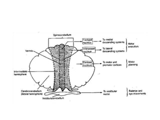 The document discusses the anatomy and functions of the cerebellum. It begins by outlining the embryonic development and subdivision of the nervous system. It then describes the three functionally distinct regions of the cerebellum - the vestibulocerebellum, spinocerebellum, and cerebrocerebellum - and their different inputs and outputs. The document also discusses the cerebellar peduncles, cortex, and nuclei. It outlines the roles of the cerebellum in motor control and coordination and describes clinical signs of cerebellar dysfunction such as ataxia.
