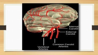 The document summarizes blood circulation to the brain. It describes how blood is supplied to the brain through two internal carotid arteries and two vertebral arteries that form a complex network called the circle of Willis. It then discusses the major arteries that branch off from this circle - the anterior, middle, and posterior cerebral arteries - and the regions of the brain each supplies. It notes that decreases in blood flow through these arteries can cause impairments or weaknesses on the opposite side of the body.