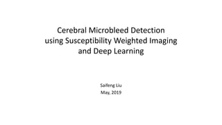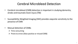 This document describes a study using deep learning to detect cerebral microbleeds (CMBs) from susceptibility weighted imaging (SWI). It found that using both SWI and phase images as inputs to a neural network led to better performance than SWI alone. The best model achieved 95.8% sensitivity and 70.9% precision, similar to human experts. This outperformed previous studies and demonstrated the potential of deep learning for medical image analysis tasks.