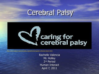 Cerebral palsy is a disorder that affects muscle movement and coordination. It is caused by damage to the developing brain, often before or during birth. There are four main types of cerebral palsy defined by the muscles affected: spastic, athetoid, ataxic, and mixed. Spastic cerebral palsy causes stiff muscles and difficult movement, while athetoid causes involuntary movements and ataxic causes problems with balance and coordination. Treatment focuses on improving quality of life through physical therapy and respecting those with cerebral palsy.