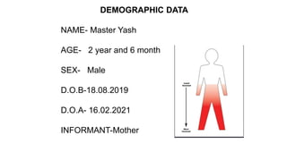 This document presents a case study of a 2 year and 6 month old male child diagnosed with cerebral palsy. It summarizes his medical history, developmental milestones, physical examination findings, and proposed treatment plan. The child exhibits delays in gross and fine motor skills and language development. He is unable to sit, stand or walk independently. The treatment plan focuses on stretching tight muscles, improving range of motion, strengthening, and working on functional activities like sitting, standing and mobility with the long term goals of independent ambulation and self-care.