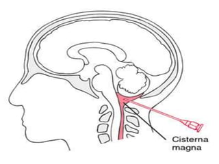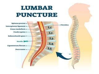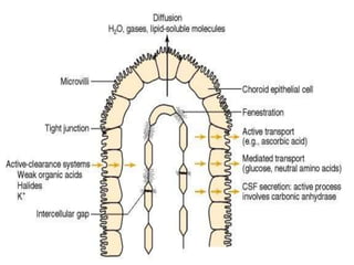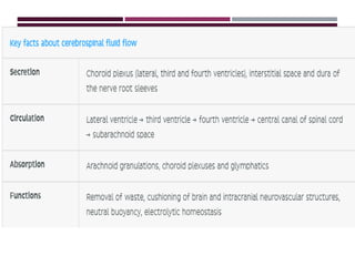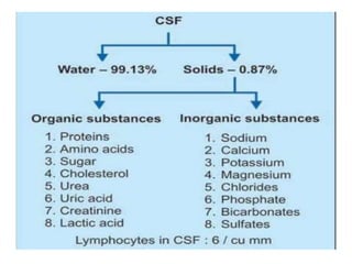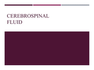 The cerebrospinal fluid (CSF) is produced by the choroid plexuses in the ventricles of the brain and circulates through the brain and spinal cord. It serves several important functions like cushioning the CNS from impacts, removing waste, and transporting molecules. CSF is constantly produced and absorbed with around 150-270mL maintained at any given time. Disorders like hydrocephalus, multiple sclerosis, and spina bifida can be diagnosed by analyzing CSF samples obtained via lumbar puncture or cisternal puncture.