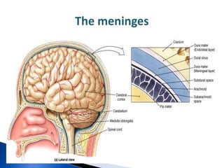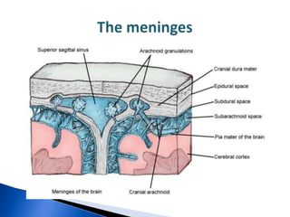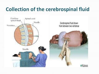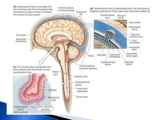 2. The document discusses the anatomy, formation, circulation, functions, and clinical analysis of cerebrospinal fluid. It describes how CSF is produced in the ventricles of the brain and circulates around the central nervous system to perform important protective and nutrient functions.