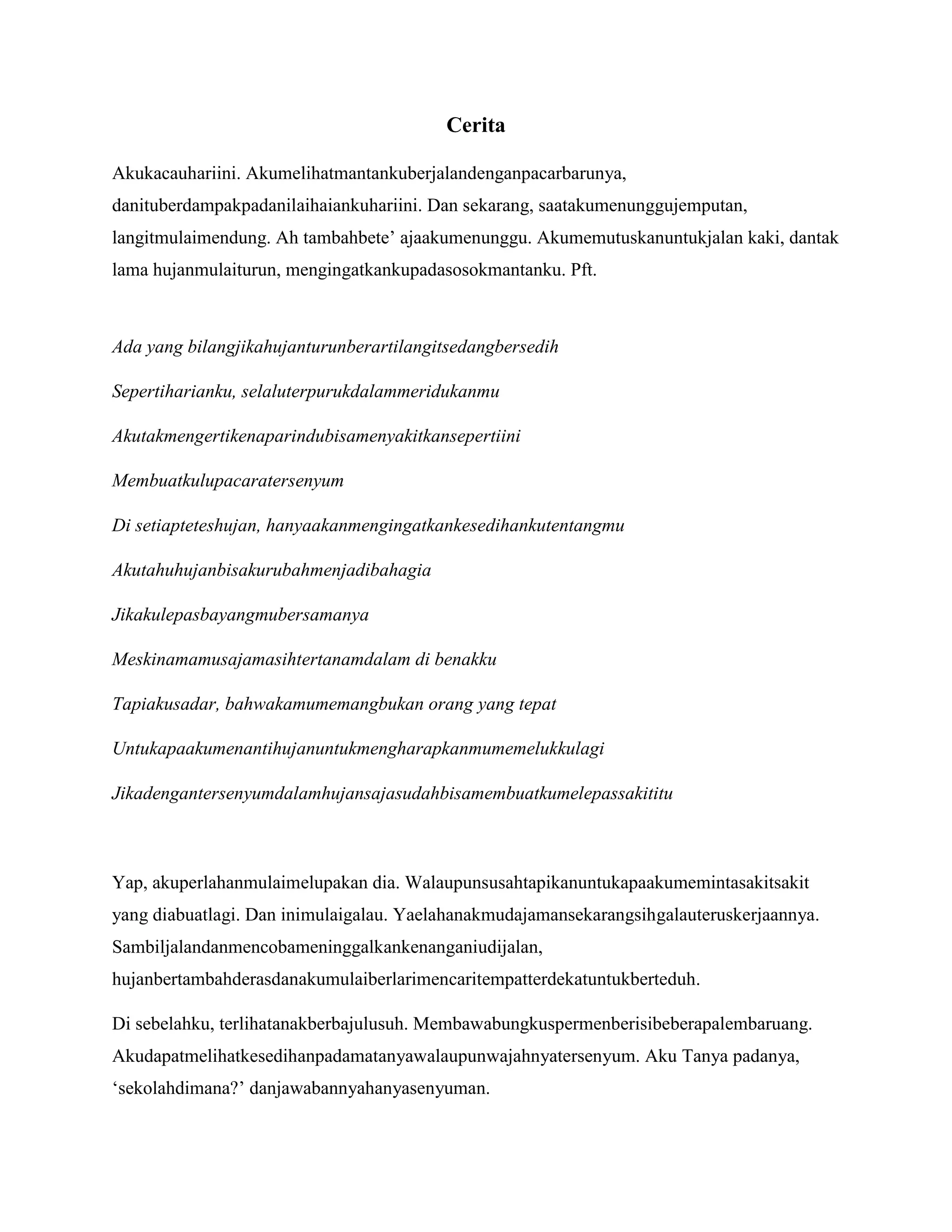 Cerita pendek ini menceritakan tentang seorang pemuda yang sedang berduka atas mantan kekasihnya. Ia kemudian bertemu dengan seorang anak kecil yang sedang berbagi cerita tentang impiannya menjadi pilot dan kesulitan hidupnya. Pertemuan itu membuat pemuda itu berpikir bahwa ada hal-hal yang lebih penting dalam hidup selain cinta.
