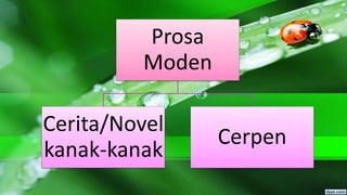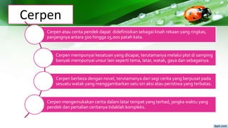 Cerpen adalah kisah rekaan pendek dengan panjang antara 500 hingga 15,000 patah kata, menampilkan kesatuan melalui plot dan unsur lain seperti tema dan watak. Terdapat berbagai jenis cerpen termasuk cerpen konvensional, cerpen absurd, dan cerpen kanak-kanak, dengan gaya penulisan biasanya beraliran realisme. Gaya bahasa dalam cerpen juga penting, seperti pemilihan kata dan dialog yang efektif, untuk memperkaya pengalaman pembaca.