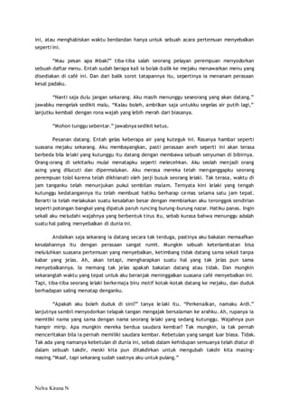 Cerpen ini menceritakan tentang seorang perempuan bernama Nelva Kirana N yang menunggu kekasihnya bernama Ardi untuk kencan pertama di sebuah cafe. Ardi tidak kunjung datang dan membuat Nelva menunggu selama satu jam. Kemudian terungkap bahwa Ardi mengalami kecelakaan saat menuju cafe, sehingga tidak jadi datang. Dua minggu kemudian, Nelva baru mengetahui kematian Ardi akibat kecelakaan tersebut