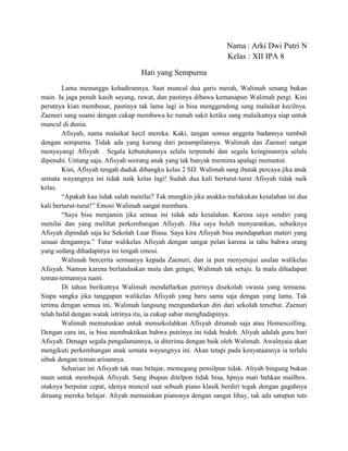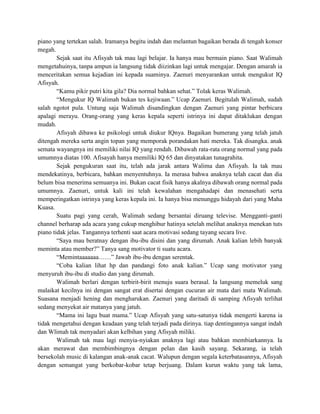 Dokumen tersebut menceritakan kisah seorang ibu bernama Walimah yang awalnya tidak menerima anaknya Afisyah yang ternyata memiliki kelainan mental. Namun setelah mendengarkan nasihat dari seorang motivator, Walimah akhirnya menerima keadaan Afisyah dan mulai merawat serta mendukungnya belajar bermain piano. Berkat dukungan ibunya, Afisyah kini menjadi seorang pianis terkenal walaupun