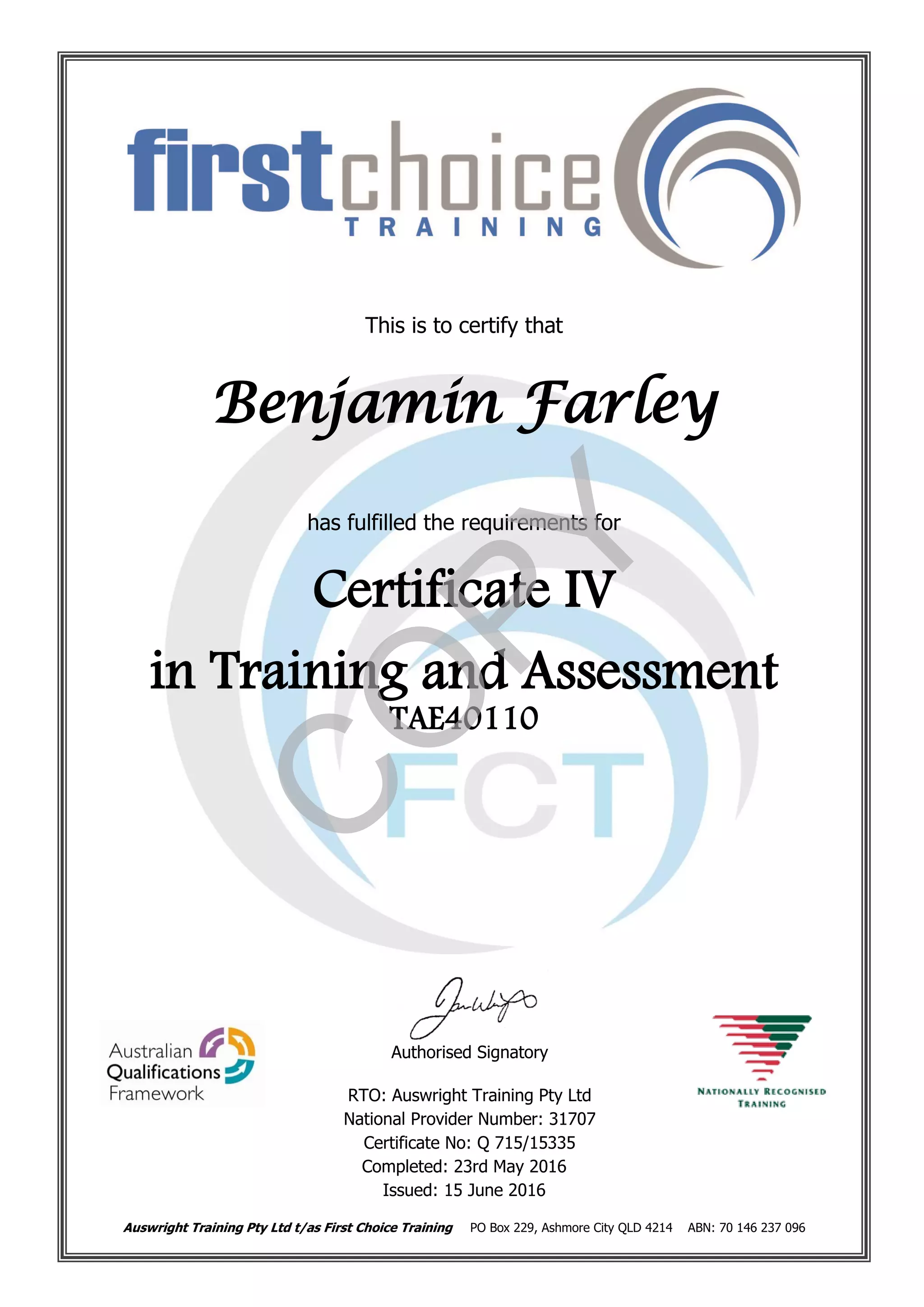 Benjamin Farley has completed the requirements for a Certificate IV in Training and Assessment. He attained competency in 10 units including contributing to assessment, planning assessment activities, assessing competence, participating in assessment validation, designing assessment tools, providing work skill instruction, planning and delivering group-based learning, planning and facilitating workplace learning, designing learning programs, and using training packages to meet client needs. The certificate was issued by Auswright Training Pty Ltd on June 15, 2016.