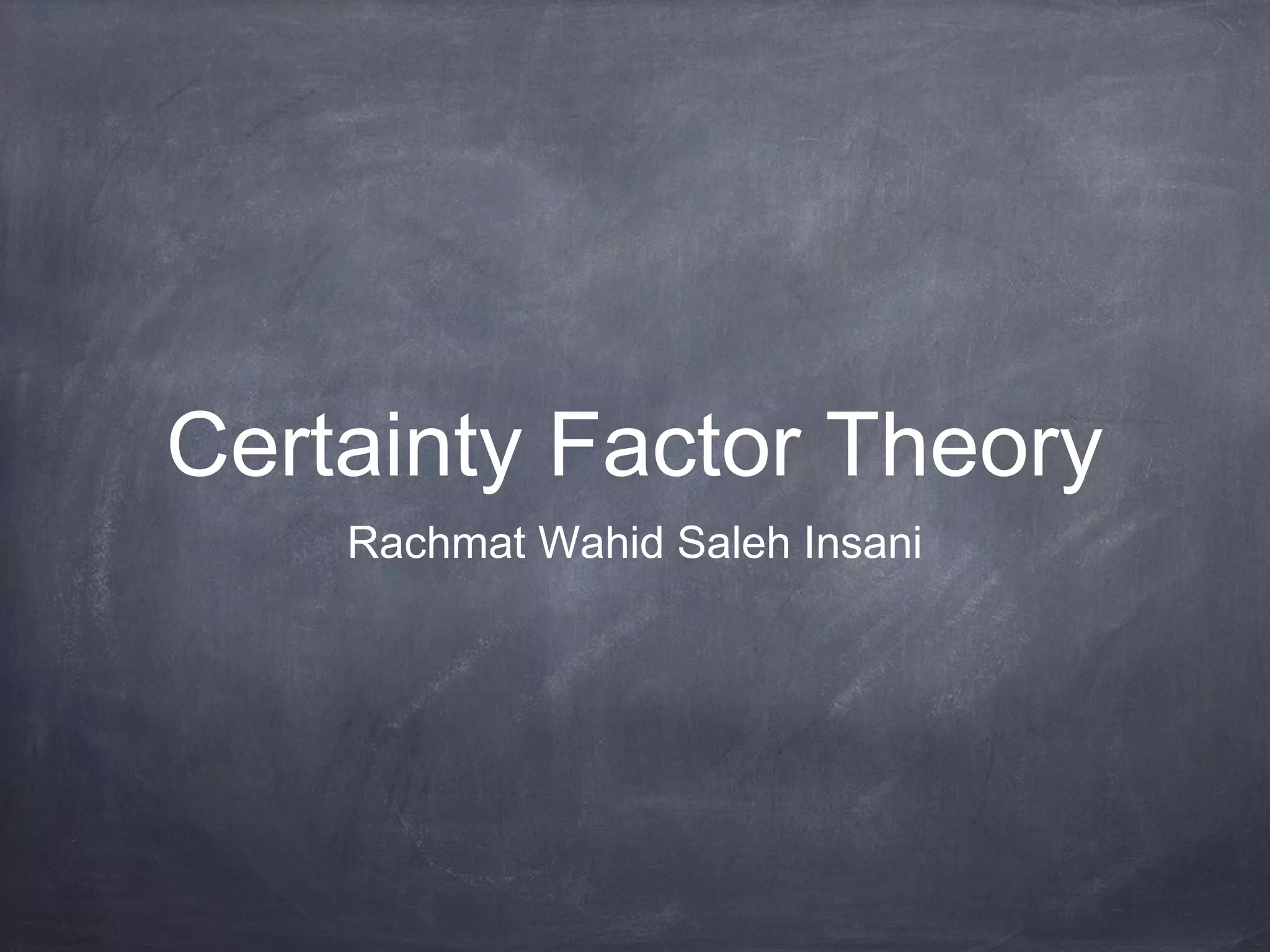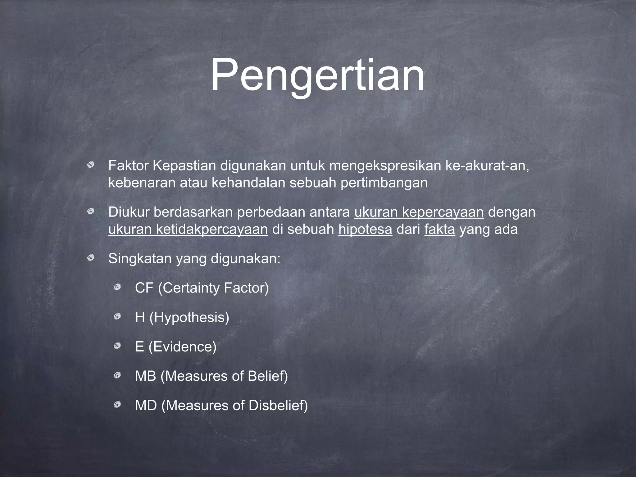 Teori Faktor Kepastian menggunakan nilai faktor kepastian (CF) untuk mengekspresikan keakuratan sebuah hipotesis berdasarkan bukti yang ada. CF dihitung dari selisih antara ukuran kepercayaan dan ketidakpercayaan terhadap suatu hipotesis, dengan nilai berkisar antara -1 hingga 1. Teori ini dapat menggabungkan pendapat dari beberapa pakar dan mempertimbangkan adanya beberapa bukti maup