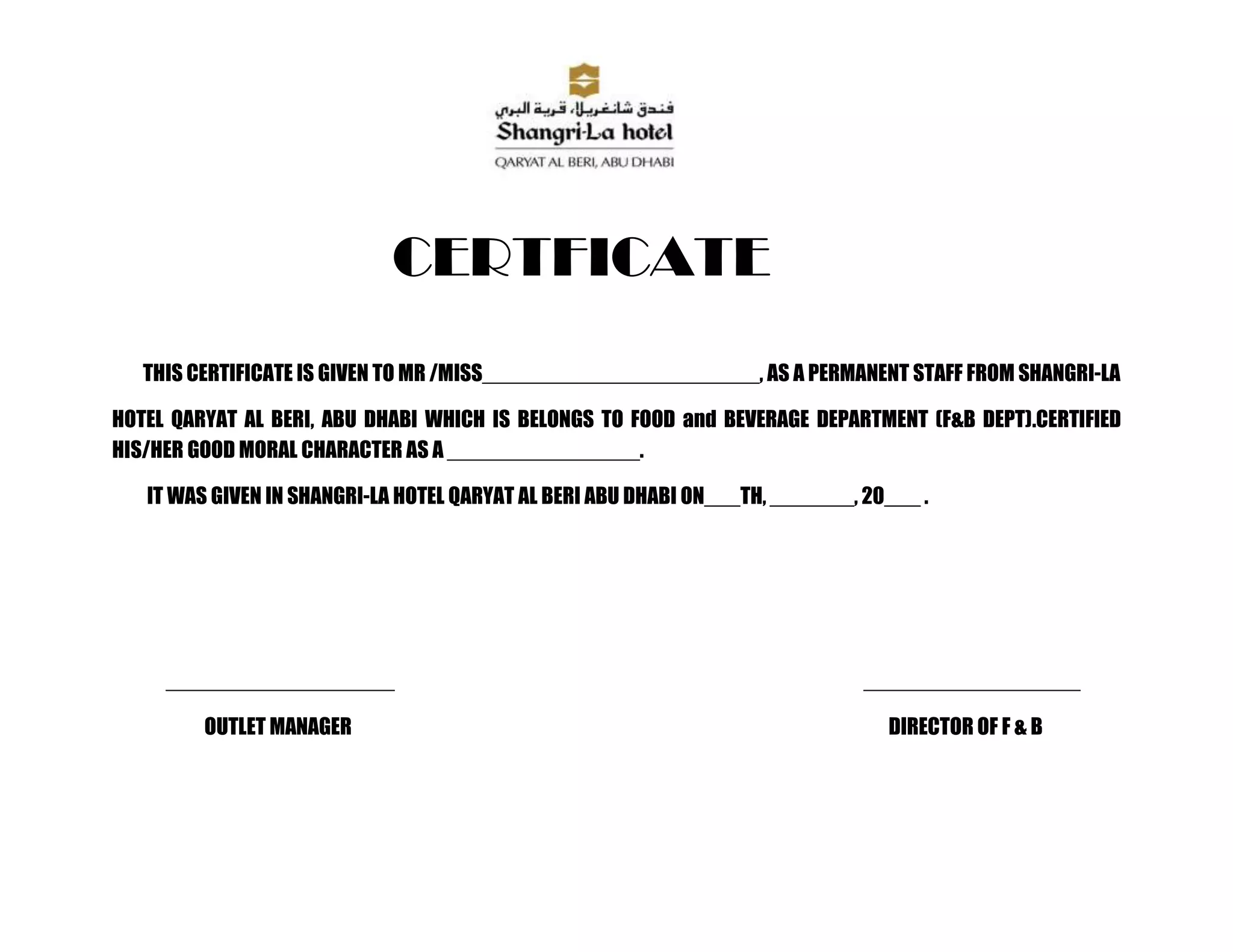 This certificate certifies that Mr/Miss [name] is a permanent staff member of the Food and Beverage Department at the Shangri-La Hotel Qaryat Al Beri in Abu Dhabi. It confirms their good moral character in their role as a [position] and was issued on [date] by the Outlet Manager and Director of Food and Beverage.