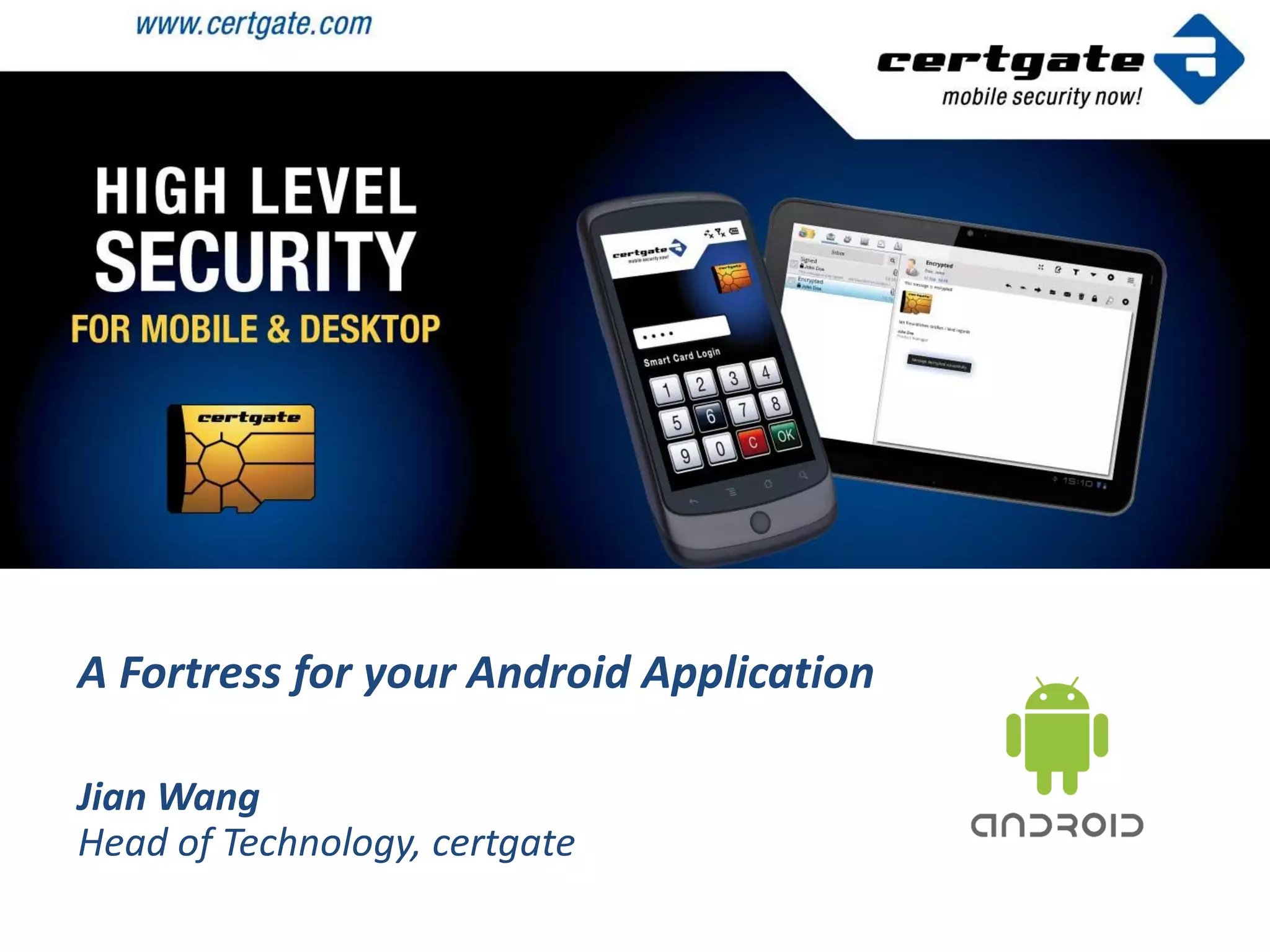 This document discusses a mobile application protection layer called certgate MAPL that provides security for Android applications. It encrypts application data, requires user authentication via PIN, and stores encryption keys securely on a hardware token. The presentation covers certgate as a company, Android security concepts, how MAPL works, its architecture and effects, and benefits like enabling BYOD policies. It concludes by promoting the product and providing a link to learn more.