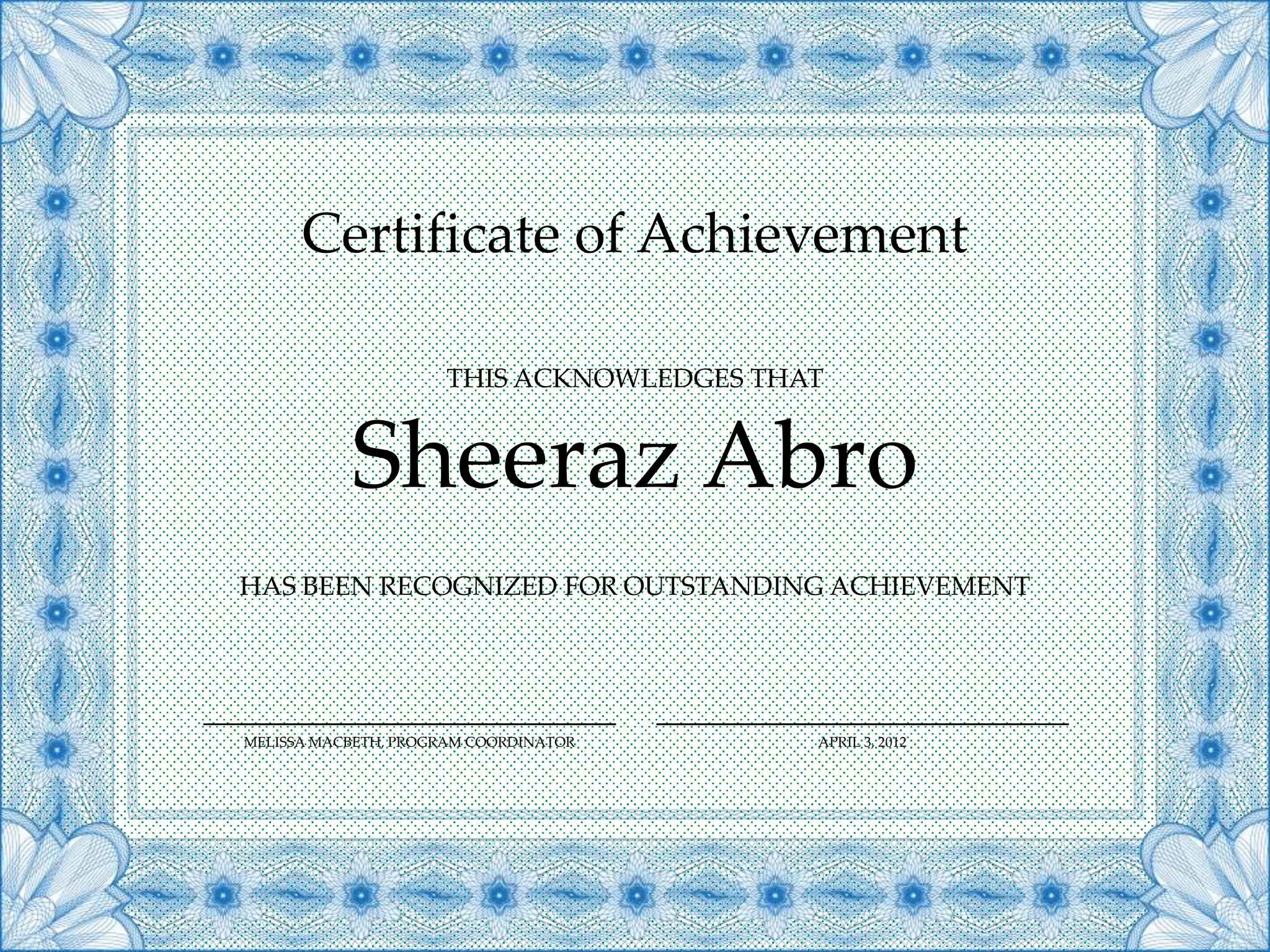 This certificate acknowledges that Sheeraz Abro has been recognized for outstanding achievement by Melissa Macbeth, the program coordinator, on April 3, 2012.