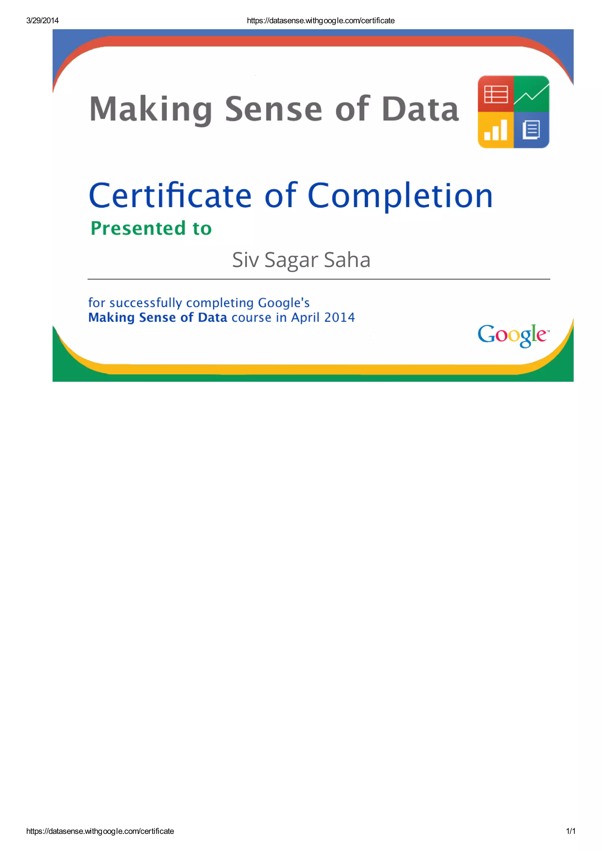 This one sentence document contains a date, a URL, and the name of an individual who appears to have received a certificate from that URL on that date. The document provides high-level information about a certificate being issued to an individual from an online source on a specific date but does not include many other details.