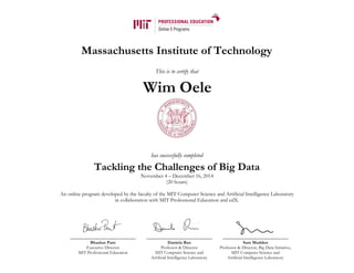 This certificate recognizes the successful completion of an online program on tackling big data challenges from November 4 to December 16, 2014. The 20-hour program was developed by MIT's Computer Science and Artificial Intelligence Laboratory in collaboration with MIT Professional Education and edX. The certificate is signed by the executive director of MIT Professional Education and the directors of the Computer Science and Artificial Intelligence Laboratory and Big Data Initiative.