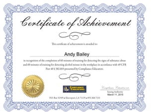 This certificate of achievement is awarded to Andy Bailey for completing 60 minutes of training for detecting signs of substance abuse and 60 minutes of training for detecting alcohol misuse in the workplace. The training was provided by ComplianceEducatorsLLC on March 11, 2015 in accordance with 49 CFR Part 40 § 382.603.