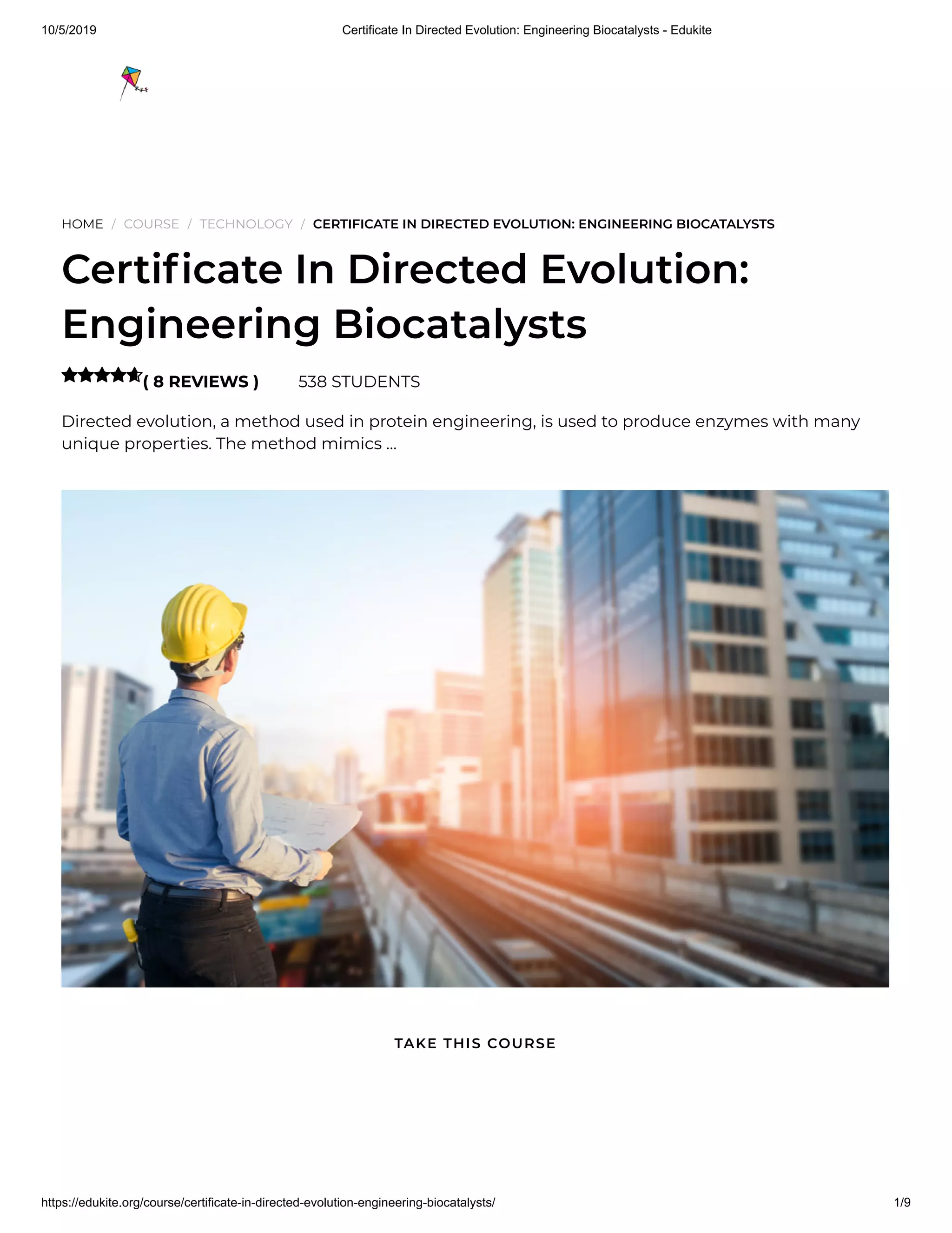 The 'Certificate in Directed Evolution: Engineering Biocatalysts' course offers a comprehensive overview of directed evolution for producing enzymes with unique properties, simulating natural selection to evolve proteins or nucleic acids. Students learn methods for library generation and enzyme selection, focusing on applications in drug synthesis and biotechnology, and must complete 5 assignments to earn a certificate. Certification is available upon completion for a fee of £49, with the course being free to study.