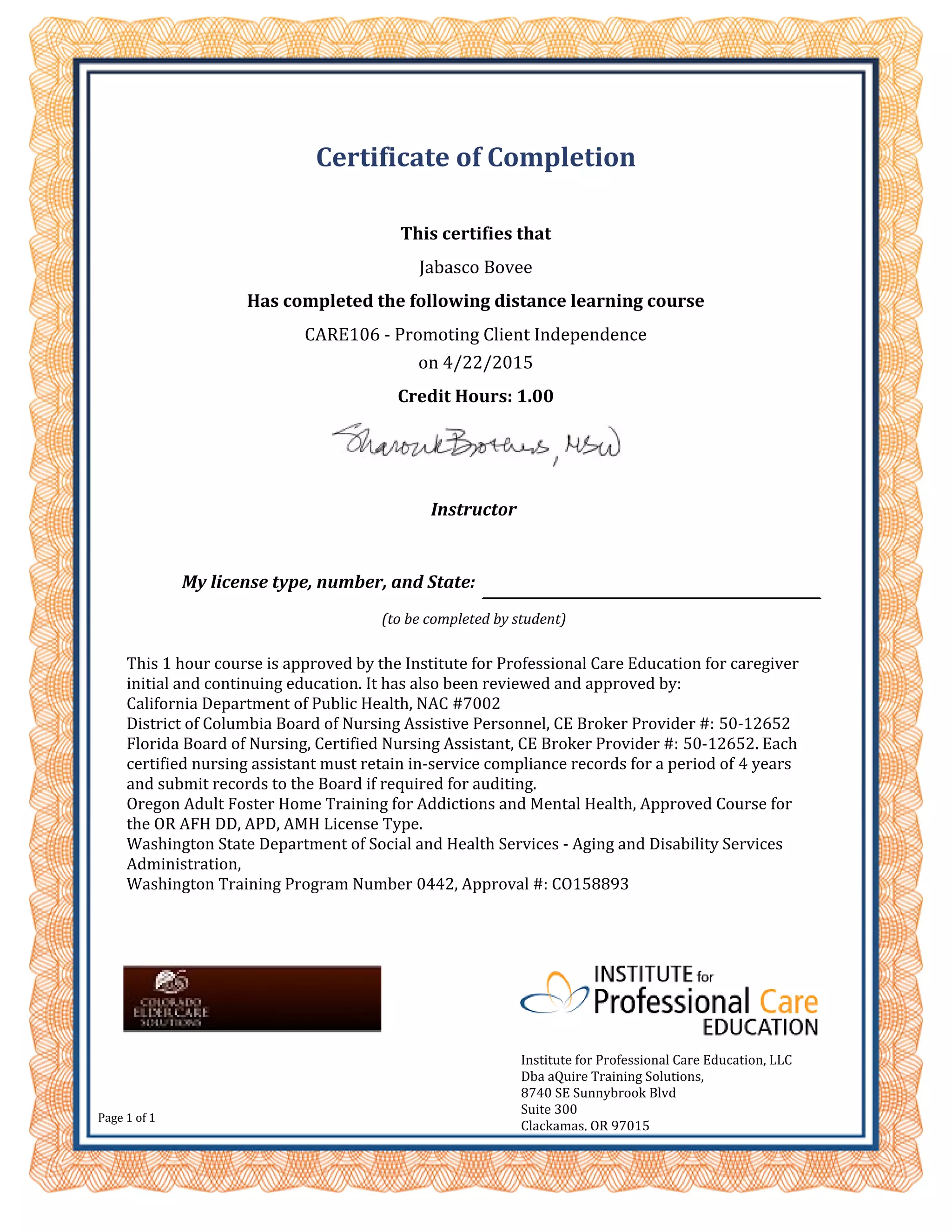 This 1-hour course is approved for initial and continuing education credits by several state agencies. It covers promoting client independence and has been reviewed and approved by regulatory boards in California, District of Columbia, Florida, Oregon, and Washington. Upon completion, students will receive a certificate from the Institute for Professional Care Education documenting the name of the course, date completed, and number of credit hours earned.