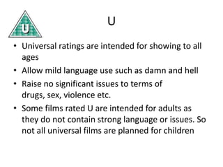 Certificate ratings provide guidelines for the content in films based on their rating. There are several categories: