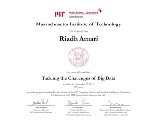 This certificate certifies that an individual successfully completed a 20-hour online program on tackling the challenges of big data from October 6 to November 17, 2015. The program was developed by faculty from MIT's Computer Science and Artificial Intelligence Laboratory in collaboration with MIT Professional Education and edX. The certificate is signed by the executive director of MIT Professional Education and directors of the Computer Science and Artificial Intelligence Laboratory and Big Data Initiative.