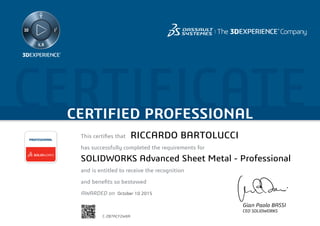 This certificate certifies that Riccardo Bartolucci successfully completed the requirements for SOLIDWORKS Advanced Sheet Metal - Professional. The certificate was awarded on October 10, 2015 and signed by Gian Paolo Bassi, CEO of SOLIDWORKS, to provide recognition and benefits for Riccardo Bartolucci's professional achievement.