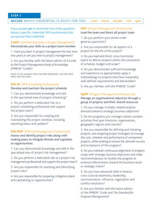 This document provides information to help determine which project management credential is most appropriate. It describes the CAPM, PMP, PgMP, PMI-SP, and PMI-RMP credentials. For each, it outlines the definition, exam fees, who should apply, education and experience requirements, and exam information to check eligibility. The goals are to help the reader choose the right credential and understand the steps to apply, earn, and maintain a PMI certification.