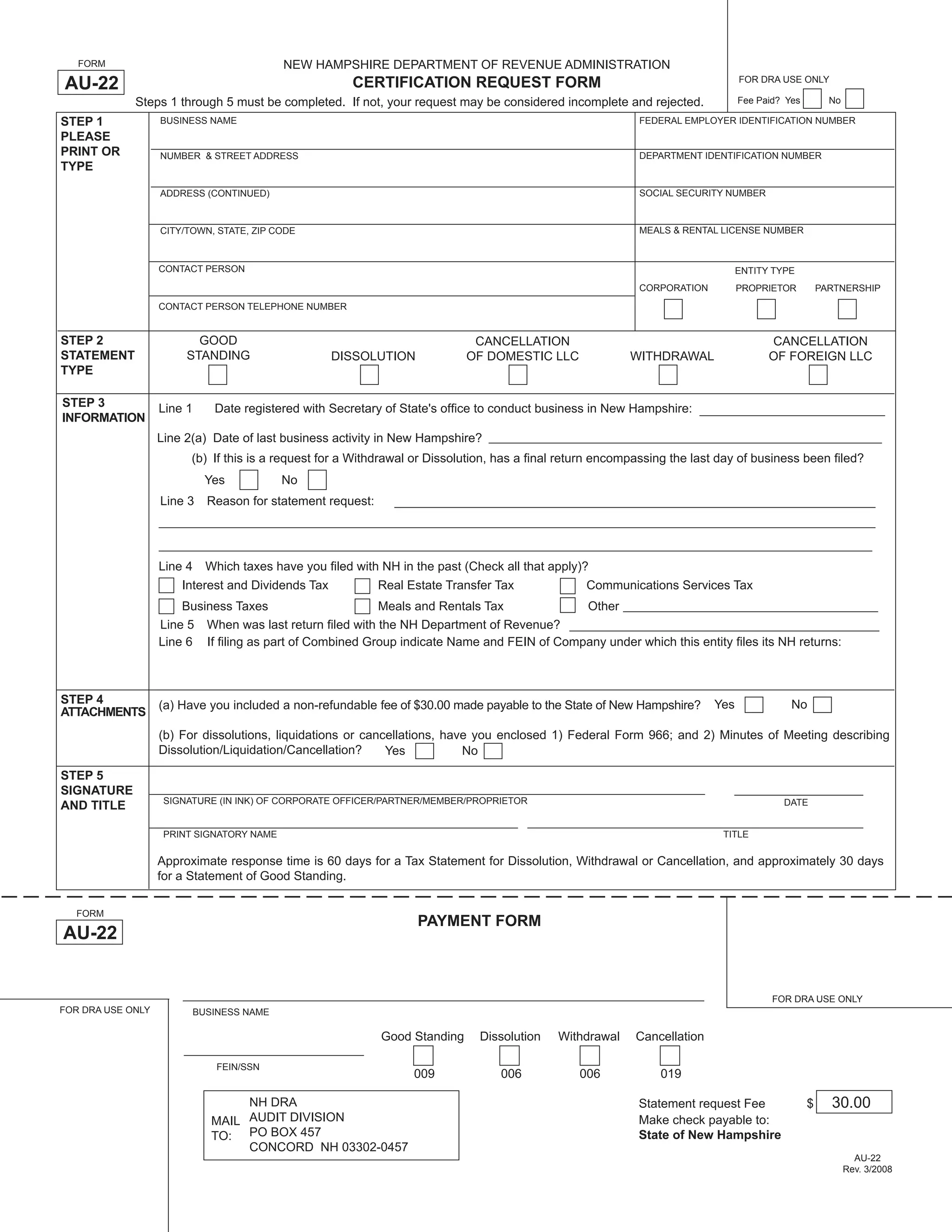 This document provides instructions for completing Form AU-22 to request a tax statement from the New Hampshire Department of Revenue Administration. The form is used to request statements of good standing, dissolution, withdrawal, or cancellation. The summary includes completing business information in Step 1, selecting the statement type in Step 2, providing details in Step 3, attaching required documents in Step 4, and signing in Step 5. A $30 non-refundable fee is due with the form.